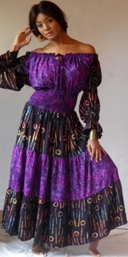 There are dresses and then there are dresses. This is one of the very special ones. Designed as a classic Mexican-inspired peasant dress, this has a ruffled, elasticized neckline with front vent and drawstring; you can wear it on your shoulders to create a scoop neck or, if the occasion warrants it, wear it off-shoulder and watch the little beads of sweat build up on his brow, 3/4 sleeves. The waist is defined by a broad swath of elasticized smocking followed by three gloriously full and gathered tiers of fabric for the skirt.Done up in a batik rayon, a great drape and flow and a soft feel next to the skin. The rich and luscious color options are designed to flatter all skin tones.One of the most ancient art objects ever discovered is the iconic "Venus of Willendorf,' a small, 4-inch stone figurine estimated to have been carved around 32,000 BC. She REALLY has curves. And people worshipped her.Celebrate your own unique 'Venus' in this very special dress. It translates your every swoop, sway and curve into the most feminine of forms. There's nothing more charming, nothing as alluring. Never doubt the magnificence of your own absolute beauty.