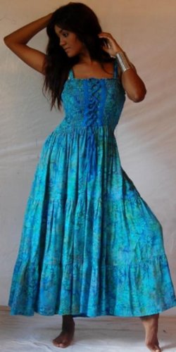 Lusciously light and fabulously feminine, this full-length dress is a romantic summertime classic.Designed with a supportive elastic-smocked bodice that has diminutive ruffling all 'round the top, spaghetti-straps that you can tie to the length that's just right for you, an easy-to-wear waistline that's raised just a bit and a multi-tiered skirt with a broad ruffle at the hem. Annie's designed the tiers to start below the hip to create a more slender silhouette.Done up in a nice rayon batik. They create a romantic look and they'll keep you cool and comfy in even the sultriest conditions.And here's a little summertime recipe:*this dress*sexy shawl*soft perfume*a flower for your hair (silk is fine)*you, in a foxy mood* candles and a matchCombine all ingredients and mix together with the one you love; a sure and fiery recipe for romance.
