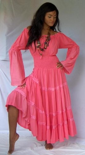 It's a peasant-styled dress, but when you wear it you're sure to feel more like a princess! This dress is simply luscious in both material and form.Annie's designed this maxi-length dress with an elasticized and ruffled scoop neckline (wear it on-shoulder or off,) a loosely gathered and full bodice, a broad swath of elasticized smocking to define the waist (complete with adjustable drawstring,) long , loose raglan sleeves with elastic above the elbow and a sumptuous skirt with multiple tiers that are defined with inset bands and lace. A broad ruffle finishes it all at the hem.Made up in a light and luscious textured rayon that's just perfect for warmer weather wear and trim adds just a touch of glamour with a satiny jacquard effect. Lace adds the final feminine touch.Sexy, fabulously feminine and completely comfortable, this dress is simply a delight to wear. You'll love the way it softly defines your curves. And the cool, sherberty look of the fabric is such a delight. Enjoy.