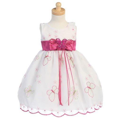 A beautiful butterfly dress for your little girl from Lito. This embroidered organza dress features fanciful butterflies throughout. The sash is adorned with ribbon detailing and ties in the back. Attached crinoline underskirt adds fullness.
