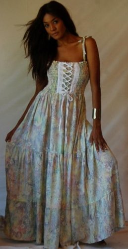 Lusciously light and fabulously feminine, this full-length dress is a romantic summertime classic.Designed with a supportive elastic-smocked bodice that has diminutive ruffling all 'round the top, spaghetti-straps that you can tie to the length that's just right for you, an easy-to-wear waistline that's raised just a bit and a multi-tiered skirt with a broad ruffle at the hem. Annie's designed the tiers to start below the hip to create a more slender silhouette.Done up in a nice rayon batik. They create a romantic look and they'll keep you cool and comfy in even the sultriest conditions.And here's a little summertime recipe:*this dress*sexy shawl*soft perfume*a flower for your hair (silk is fine)*you, in a foxy mood* candles and a matchCombine all ingredients and mix together with the one you love; a sure and fiery recipe for romance.