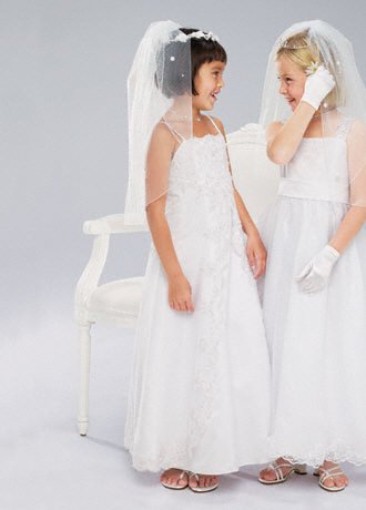 The Detailed Description of David's Bridal Child s Veil with Pearls and Flowers Style C5678, White, Bridal Wedding Fascinator