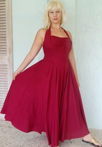 Reminiscent of the most glamorous gowns worn by the classic Hollywood divas of the 1950's, you just don't find dresses these days with the glamour and classy, understated elegance that characterize this most alluring gown.Designed with broad halter straps that tie at the back of the neck, a sweetheart neckline with radiating ruching at the bust, princess seaming on the bodice, elasticized smocking at the side of the waist to create a perfect individualized fit, a multi-paneled and gracefully long a-line skirt, and a back zipper for easy on and off access.Done up in a silky smooth and sensuously soft rayon fabric with a fluid flow and a great drape, the skirt is designed to partner with the fabric to move just the way you want it to.We all remember the iconic images of Marilyn, Grace Kelly, Ginger Rogers and Lena Horne in gowns like this. They radiated a beauty and elegance uncommon today.Luckily for us, Annie's recreated the type of glamour that's seemed out of reach for so long. So, if you've ever had a longing to match the grace and glamour of the classic divas, you won't want to miss this opportunity. Only one thing to remember: watch out for those sidewalk hot air vents.