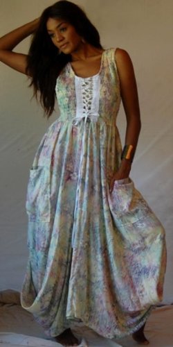 This is simply a great all-round dress. From every angle, aspect and perspective, it does what you want. And a little bit more.An all-time customer favorite because of its comfort, figure-flattering design and classic boho panache, it's had an Annie-update that makes it even a little nicer and fully up-to-date.The sleeveless design has a broad, sexy scoop neckline, functional lacings that run all down the front, a supportive elastic-smocked bodice (front/back) and a slightly raised waist that's both flattering and easy-to-wear. The skirt is full-length and flowing and sports handy patch pockets (Yippee!) made from contrast border print fabric.The update is at the hemline, where it's pulled up at the center front into an asym scallop effect that's pure fum.Done up in a 1st quality rayon batik. It's soft and comfy, a little gauzy, the flow is wonderful.If the economy's made you a little bit 'risk-averse,' and you're looking for a 'sure bet,' then this is for you. This style has helped lots of us of every size, shape and form to look our best and feel that way, too for year after year. And isn't the new hemline adorable?