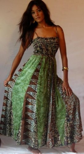 Nobody does this beloved summer-time classic better than Lotustraders. The bodice is elastic-smocked, both front and back, to create a comfy, supportive and carefree fit, spaghetti straps tie so that you can adjust them to just the right length, and triangular insets all the way around the skirt create an artsy, boho cache and a swingy a-line form. The sweetest, most delicate little ruffles encurcle the bodice top and waist.Made up in a duo of light and luscious rayon batiks with exquisite patterning and detail.This is a classic that will never be out of style. You'll enjoy wearing it for years to come. And truth be told, nobody does it near as well as we do at Lotustraders'.