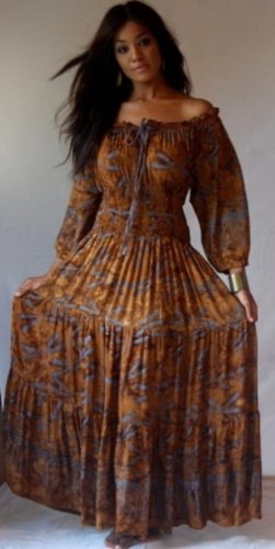 There are dresses and then there are dresses. This is one of the very special ones. Designed as a classic Mexican-inspired peasant dress, this has a ruffled, elasticized neckline with front vent and drawstring; you can wear it on your shoulders to create a scoop neck or, if the occasion warrants it, wear it off-shoulder and watch the little beads of sweat build up on his brow, 3/4 sleeves. The waist is defined by a broad swath of elasticized smocking followed by three gloriously full and gathered tiers of fabric for the skirt.Done up in a batik rayon, a great drape and flow and a soft feel next to the skin. The rich and luscious color options are designed to flatter all skin tones.One of the most ancient art objects ever discovered is the iconic "Venus of Willendorf,' a small, 4-inch stone figurine estimated to have been carved around 32,000 BC. She REALLY has curves. And people worshipped her.Celebrate your own unique 'Venus' in this very special dress. It translates your every swoop, sway and curve into the most feminine of forms. There's nothing more charming, nothing as alluring. Never doubt the magnificence of your own absolute beauty.